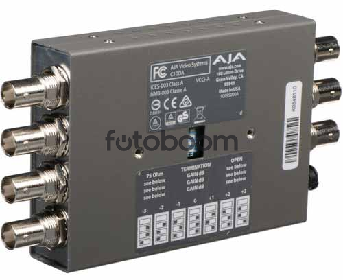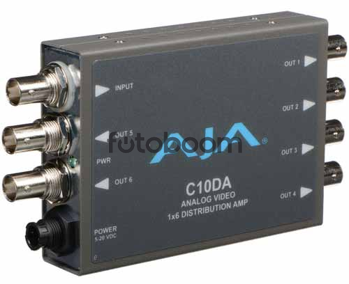 | OBSERVACIONES | El amplificador de distribución analógico BNC 1x6 C10DA de AJA cuenta con una entrada de vídeo analógica BNC y seis salidas BNC compatibles con señales NTSC y PAL. Admite señales de referencia binivel y trinivel, y es compatible con AES-id y LTC. El amplificador cuenta con un interruptor DIP para la configuración de entrada/salida, terminación de señal y ganancia. Incluye una fuente de alimentación universal. |