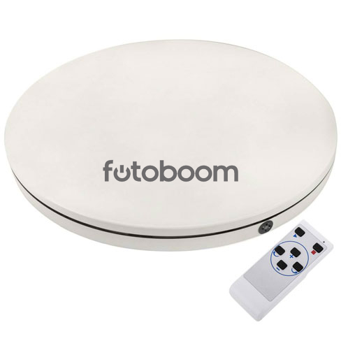 Base giratoria motorizada. Medidas: 80cm (diámetro) x 7.5 cm (altura). Carga soportada: 100 Kg. Giro: 360°. Base redonda fabricado en metal de alta resistencia, pintado de color blanco marfil. Sentido de giro horario y anti-horario. Rotación manual o automática motorizada. Sistema de embrague que permite frenar o acelerar la plataforma, incluso cuando está activada. Velocidad de rotación ajustable: 0.5RPM - 2RPM. |