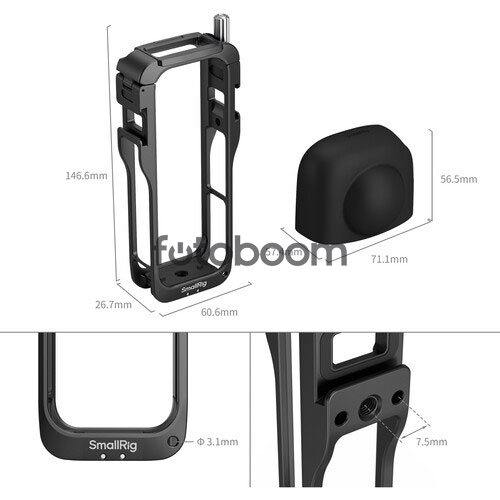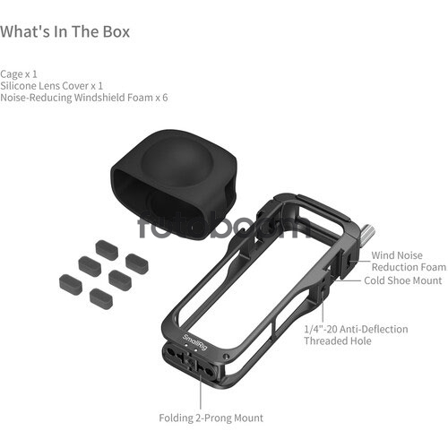 | OBSERVACIONES | Protege tu cámara de acción Insta360 X5 y mantén el acceso a su puerto de lente, controles y compartimento de la batería con esta jaula de SmallRig . Su diseño ajustado de aluminio de marco completo protege tu cámara y ofrece múltiples opciones de montaje para accesorios. La jaula cuenta con dos zapatas integradas y dos roscas de 1/4"-20 antirrotación que permiten añadir rápidamente una luz, un micrófono u otro accesorio. La cámara se puede montar en un trípode o equipo de mano utilizando la zapata plegable de dos puntas para cámaras de acción para tomas verticales o una de las roscas de 1/4"-20 laterales para tomas horizontales. La funda de silicona incluida protege la lente cuando no se utiliza. |