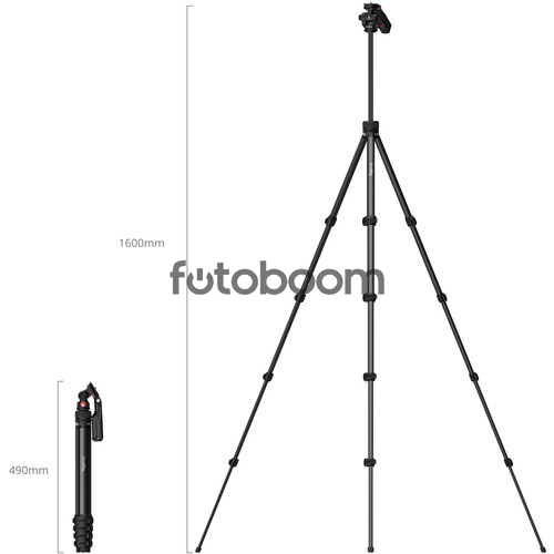 | CARACTERÍSTICAS TÉCNICAS | Montaje de cámara/dispositivo: - Tornillo de 1/4"-20(Placa de liberación rápida) - Compatible con dispositivos de 2,2 a 3,5" / 5,7 a 8,8 cm de ancho Tipo de cabeza: Cabezal panorámico e inclinable Control de arrastre: No Material primario: Aluminio Capacidad de carga: 2,2 libras / 1 kg Altura máxima de trabajo: 63" / 160,0 cm Longitud cerrada: 19,3" / 49,0 cm Peso: 1,6 libras / 718 g |