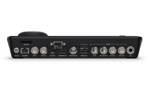 | CARACTERÍSTICAS GENERALES | Pantalla táctil de 7" Controles de la plataforma de transmisión con dial de búsqueda Graba en discos SD/USB-C/tarjetas de red Vídeo DCI 4K, espacio de color HDR Formatos de archivo H.264/265, ProRes y DNx Entrada 12G-SDI, 2 salidas 12G-SDI Ethernet de 10 Gb/s, E/S remota E/S HDMI, salidas de monitor, E/S de referencia Capacidad de cámara web, función de teleprompter |