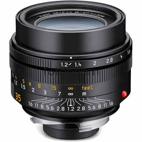 | CARACTERÍSTICAS TÉCNICAS | Objetivo: Leica Noctilux-M 35 f/1.2 ASPH. N.º de referencia: 11 635 Diagonal/Horizontal/Vertical (24×36 mm): 63.3° / 54.3° / 37.7° Número de lentes/enlaces: 10/5 Número de superficies esféricas: 3 Posición de la pupila de entrada antes del plano de bayoneta: 24.5 mm Zona de trabajo: 0.5 m to ? Escala: Distribución combinada metros (m)/pies (ft) Campo de imagen mínimo: Full-frame: 277 × 416 mm Escala máxima: 1:11.6 Ajuste/Función: Pasos de luz ajustables en dos niveles Apertura mínima: 16 Número de láminas del diafragma: 11 Bayoneta: Bayoneta Leica M con codificación de 6 bits Rosca para filtros: E49 Parasol: Extraíble Longitud: Aprox. 50.2 mm Diámetro: Aprox. 64.6 mm Peso: Aprox. 416 g |
