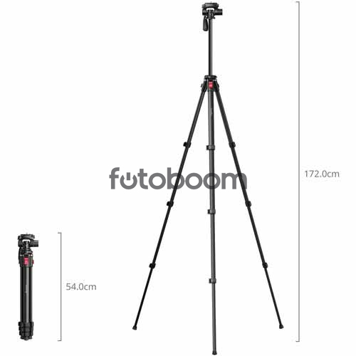 | CARACTERÍSTICAS GENERALES | Montaje de la cámara: Tornillo de 1/4"-20 (placa de liberación rápida) Tipo de cabeza: Cabeza fluida Control de arrastre: Sí Material primario: Aluminio Capacidad de carga: 4,4 libras / 2 kg Altura máxima de trabajo: 67,7" / 172 cm Altura mínima de trabajo: 20,3" / 51,5 cm Longitud cerrada: 21,3" / 54 cm Peso: 40,7 onzas / 1154 gramos |