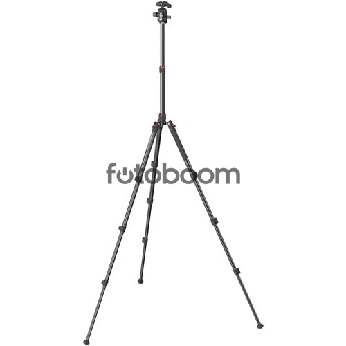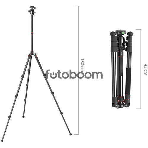 | CARACTERÍSTICAS TÉCNICAS | Montaje de la cámara: Tornillo de 1/4"-20 (Placa de liberación rápida: tipo Arca) Tipo de cabeza: Cabezal de bola Control de arrastre: No Material primario: Aluminio Capacidad de carga: 11 libras / 5 kg Altura máxima de trabajo: 71" / 180,3 cm Altura mínima de trabajo: No especificado por el fabricante Longitud cerrada: 16,9" / 43 cm Peso: 3,4 lb / 1,5 kg |