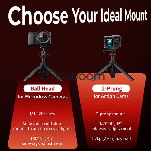 | CARACTERÍSTCAS TÉCNICAS | Montaje de la cámara: Tornillo de 1/4"-20 (sin liberación rápida) Tipo de cabeza: Cabezal de bola Control de arrastre: No Material primario: Aluminio Capacidad de carga: 2,6 lb / 1,2 kg Altura máxima de trabajo: 16,1" / 41 cm Altura mínima de trabajo: 8" / 20,3 cm Longitud cerrada: 8,0" / 20,3 cm Peso: 12,3 oz / 349 g |