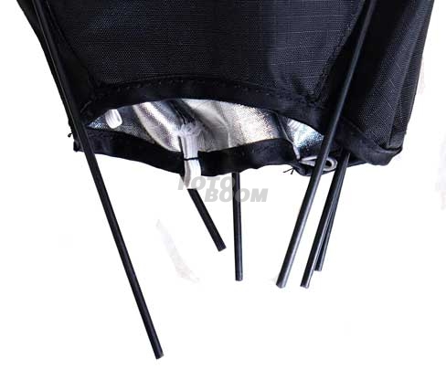 | Caracteristicas generales | Montaje extremadamente fácil tirando de sus 6 barillas que van al anillo central Para plegar la caja basta con utilizar la lengüeta de la parte superior para liberar las varillas. Lo más caracteristico es que el flash se puede montar directamente en el difusor, La rotula curvada permite mover fácilmente la direccion del difusor Superligero y pequeño estuche de transporte para almacenamiento El difusor se puede conectar al soporte de flasha través de una zapata 24 meses garantia de fábrica |