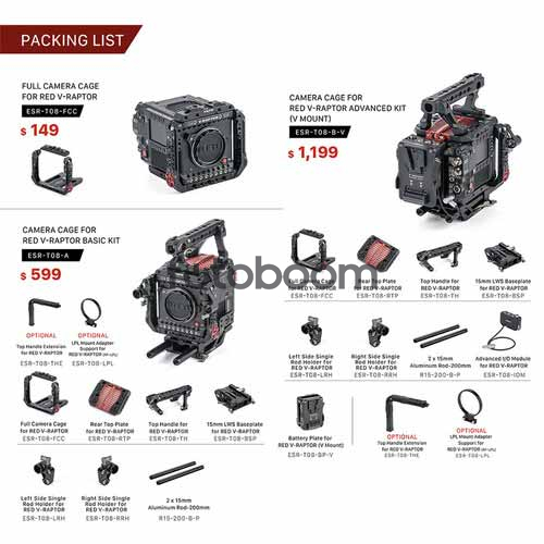| OBSERVACIONES | El kit de jaula para cámara Tilta Advanced amplía la configuración del kit básico y lleva la configuración de tu cámara RED V-RAPTOR portátil al siguiente nivel gracias a su placa de batería con montura V incluida. Tus capacidades de conexión se amplían aún más con un módulo de E/S avanzado que añade más puertos a tu cámara para funciones como código de tiempo, genlock y alimentación. |